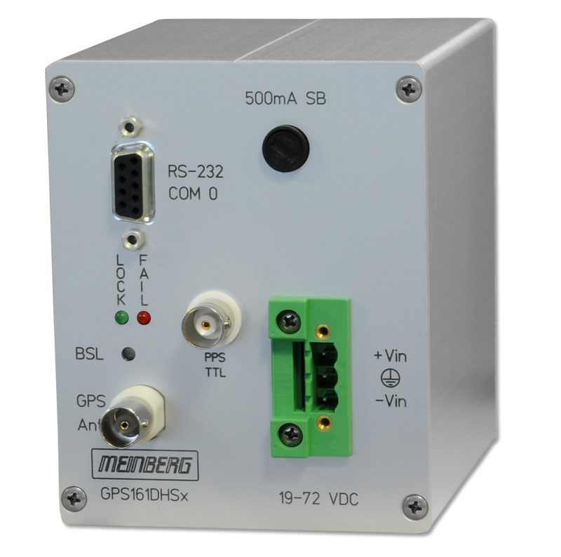 | Statusanzeigen | Fail-LED zeigt an, dass das interne Zeitraster noch nicht synchronisiert wurde oder dass ein Systemfehler aufgetreten ist. Lock-LED zeigt an, dass eine Positionsbestimmung durchgeführt wurde und dass die Satellitenfunkuhr synchron zum GPS-System ist. |