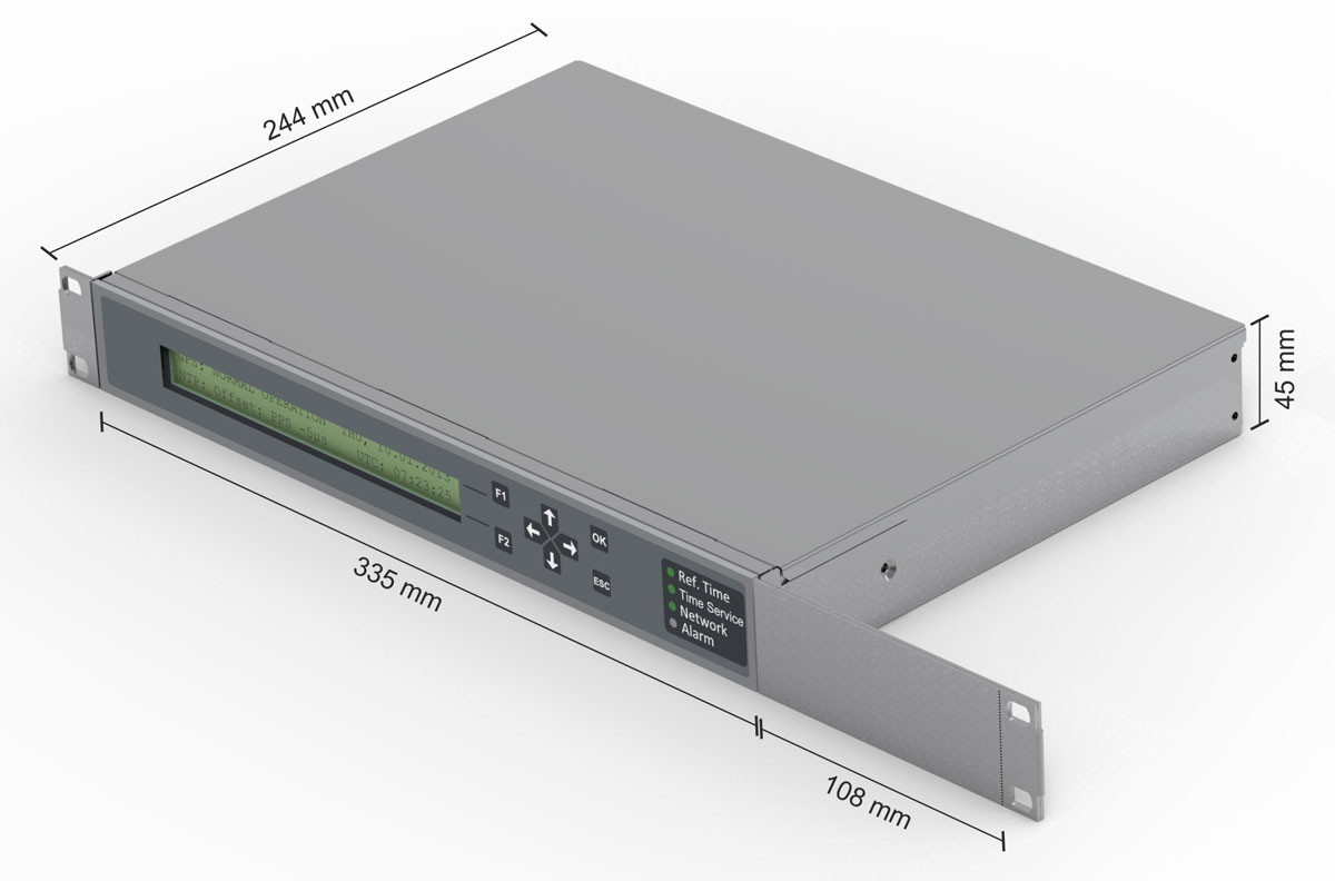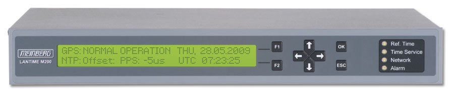 Ein gut lesbares LCD Display zeigt den Status der Referenzzeit und des Zeitservice an. Außerdem signalisieren drei Bicolor-LEDs die Betriebszustände der wichtigsten Komponenten: Referenzzeit (z.B. GPS), Zeitservice (NTP) und Netzwerkstatus. Eine rote Alarm-LED wird bei vorliegenden Störungen aktiviert (kann konfiguriert werden).