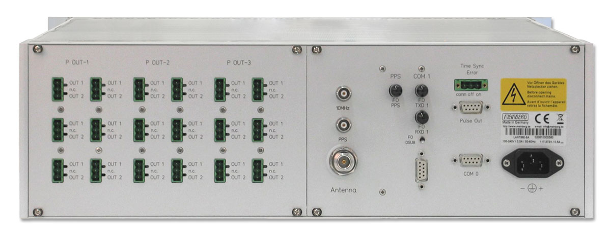 Mögliche Konfigurationen können eine Vielzahl von Ausgängen wie 1PPS, 10MHz, IRIG Time Codes, serielle Zeitstrings enthalten, aber auch bis zu 9 LAN Schnittstellen.