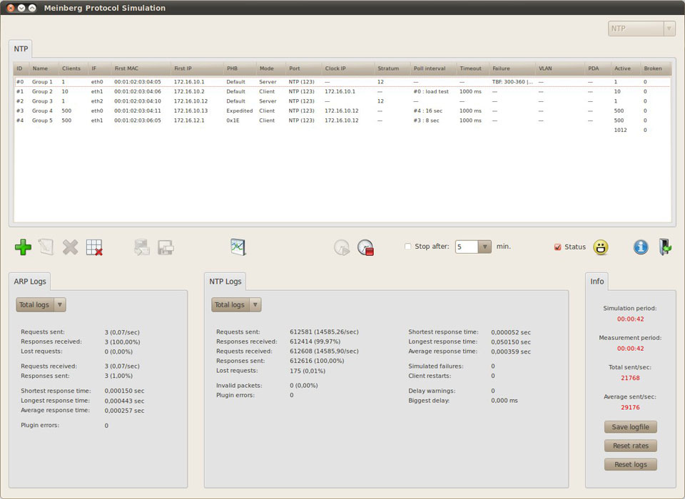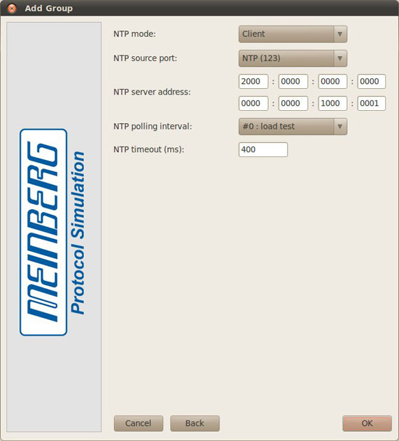 Mit der hier dargestellten Konfiguration erstellt der Benutzer NTP Clients im Load Test Modus. Im Load Test Modus stellt ein