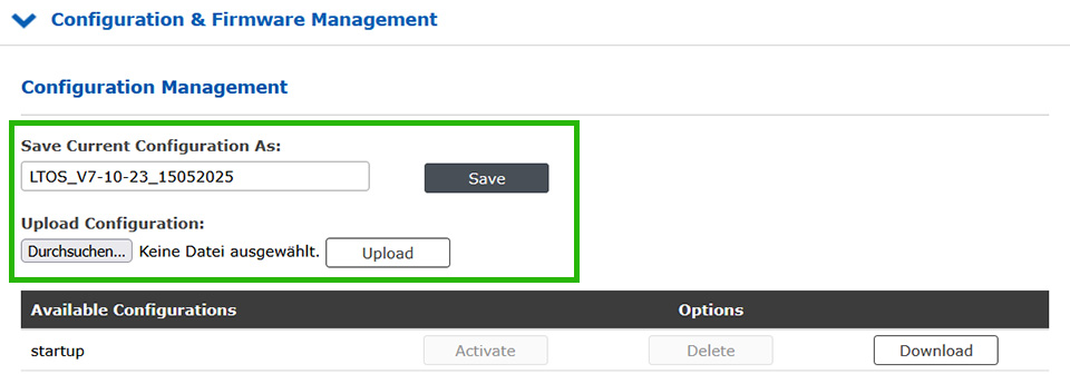 Über den Menüpunkt "System -> Konfiguration & Firmware Management" (ab LTOS 7.10 "Konfigurationsverwaltung") im Webinterface können Sie auch jederzeit wieder eine ältere Firmware-Version aktivieren. Hier können Sie auch über "Aktuelle Konfiguration sichern als:" die aktuelle Konfiguration Ihres LANTIME speichern. Das so erstellte Backup Ihrer Konfiguration ist dann auf diesem Lantime Zeitserver unter "Available Configurations" gespeichert. Mit einem Klick auf den Download Button kann das Backup lokal auf einem PC abgespeichert werden. Nun haben Sie die Möglichkeit diese, lokal gespeicherte, Konfiguration auch für weitere LANTIME-Zeitserver zu verwenden und hochzuladen.