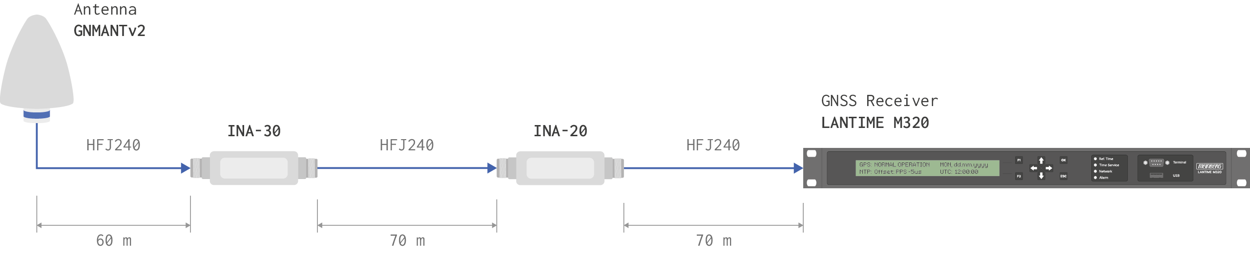 Im oben aufgeführten Beispiel ist die Antenne direkt über ein 60 m-Kabel mit dem ersten INA-30-Verstärker verbunden und danach mit zwei 70 m-HFJ240-Kabelstrecken, zwischen denen ein INA-20-Verstärker geschaltet ist. Die Anordnung der Verstärker und Kabelsegmente haben grundsätzlich keine Auswirkung auf die Signalverstärkung am empfängerseitigen Ende der Antennenleitung - denkbar wäre auch das 70 m-Kabel als erster Segment und das 60 m-Kabel am Ende. In beiden Szenarien (70 m → 70 m → 60 m sowie 60 m → 70 m → 70 m) fällt eine Verstärkung von ca. 21 dB am empfängerseitigen Ende an (bei dem Einsatz einer GNMANTv2-Antenne mit einer Verstärkung von 37 dB).