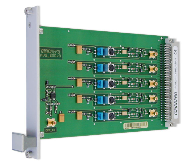 DCF77 Verteiler AV5 im Europakartenformat.Die Baugruppe AV5 verteilt ein amplitudenmoduliertes DCF77-Eingangssignal auf fünf getrennte Ausgänge. Das Ausgangssignale stehen sowohl an der Messerleiste als auch an SMB-Antennenbuchsen auf der Platine potentialfrei und unverstärkt zur Verfügung und ist an den Empfangskreis von Meinberg AM-Funkuhren angepaßt.
