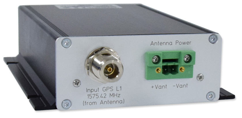 | Elektr. Anschlüsse | - N-Norm Buchse für GPS Antenne (optional SMA - Buchse) - N-Norm Buchse für Meinberg GPS Empfänger - 2-polige Phoenix Klemme für Betriebsspannung einer aktiven Antenne |