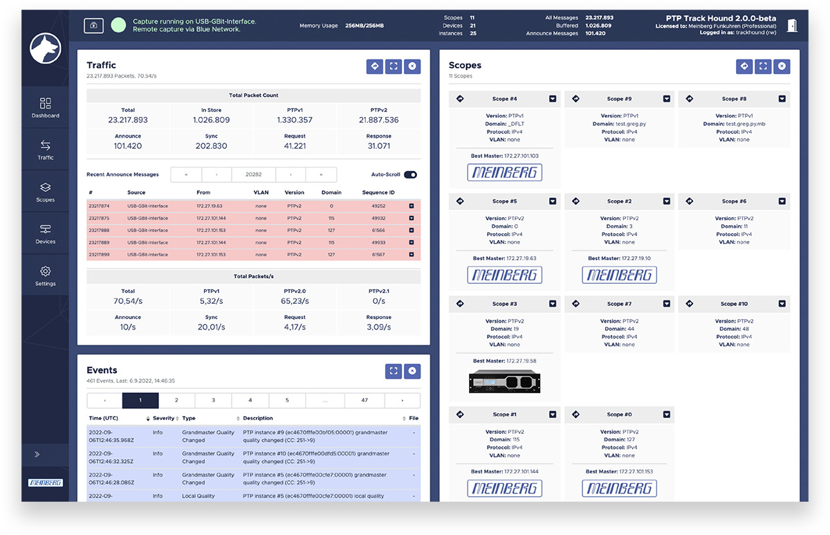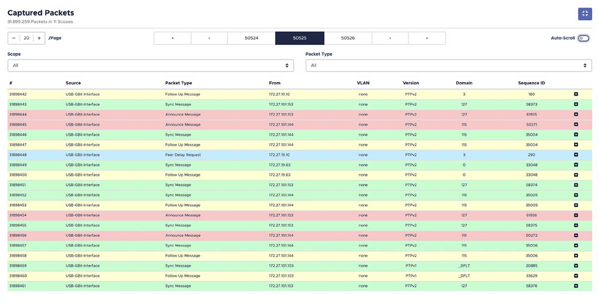 PTP Track Hound erfasst den PTPv1-, PTPv2- und PTPv2.1-Netzwerkverkehr auf den konfigurierten Adaptern, wobei der Hauptspeicher (RAM) zur vorübergehenden Speicherung verwendet wird. Es ist auch möglich, alle erfassten Pakete in eine dauerhafte Erfassungsdatei zu speichern, die dann über das Webinterface heruntergeladen werden kann.