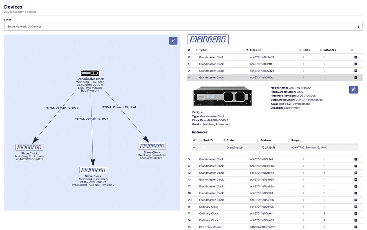 PTP-Geräte im Netzwerk werden automatisch erkannt und in Scopes gruppiert, um eine einfache Identifizierung der Taktbeziehungen zu ermöglichen.