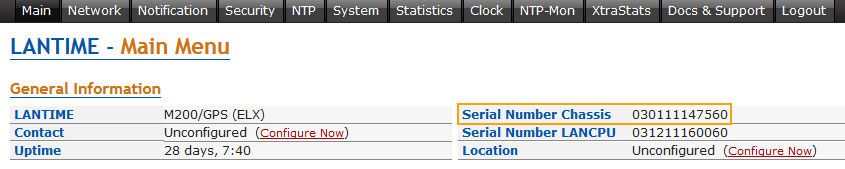 Option 2: Bei LANTIME Zeitservern können Sie die Seriennummer über das Display oder über das Webinterface abrufen."